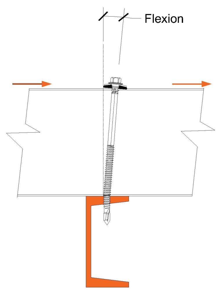 Les vis de fixations longues utilisées pour fixer les panneaux composites et les plaques de fibrociment, et dont la tête est éloignée du support, sont généralement soumises à des efforts de flexion. Dans le cas des composites, ces efforts de flexion sont généralement dynamiques et répétitifs. Ces efforts sont générés par les déflexions et les mouvements thermiques des panneaux, et la flexion de la fixation est généralement plus importante dans les profilés de support laminés à chaud, généralement moins flexibles, que dans les profilés laminés à froid plus fins.